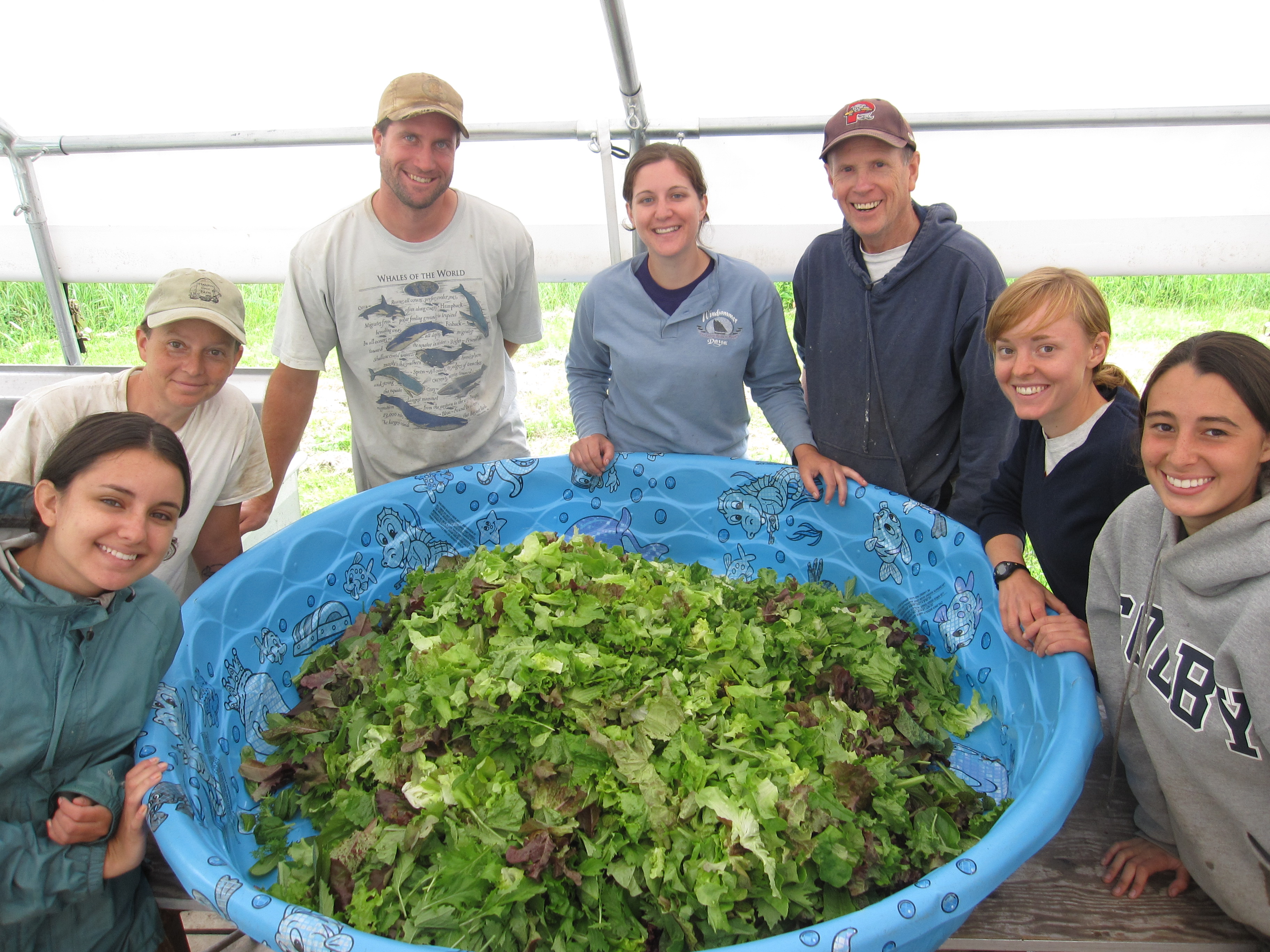 Our awesome June crew around the salad-mixing pool (yes, that is your salad in there!). We harvest separately each component of the mix then sort, wash, and spin it dry, then mix it all together in this pool, then bag it up for you! L to R is Margo, Laurie, Bill, Emma, Bob, Hanni, and Erin with the salad mix on the first CSA harvest day of the year.