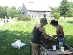 Hanni and Erin seedling fall vegetables under the big maple, with Margo pulling a wagon up the driveway full of more seeding supplies.