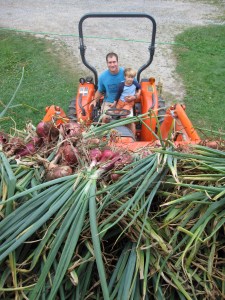 Bill and Eli, lifting a tractor load of shallots up into the second floor of the barn to dry. We probably laid out eight or nine loads of this size.
