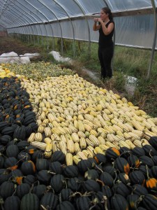 We brought in an amazing winter squash harvest this week. Three extremely full pickup loads of Acorn, Delicata, Butternut Squash, and Pumpkins and decorative gourds were spread on the floor of the hoophouse to cure. Acorns are the first to ripen, followed by Delicata and Butternut (the longer you can wait to eat them before they rot, the