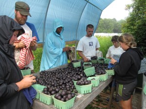 Sorting purple potatoes into quarts for wholesale. The potatoes are first dug then washed, dried, and boxed up.