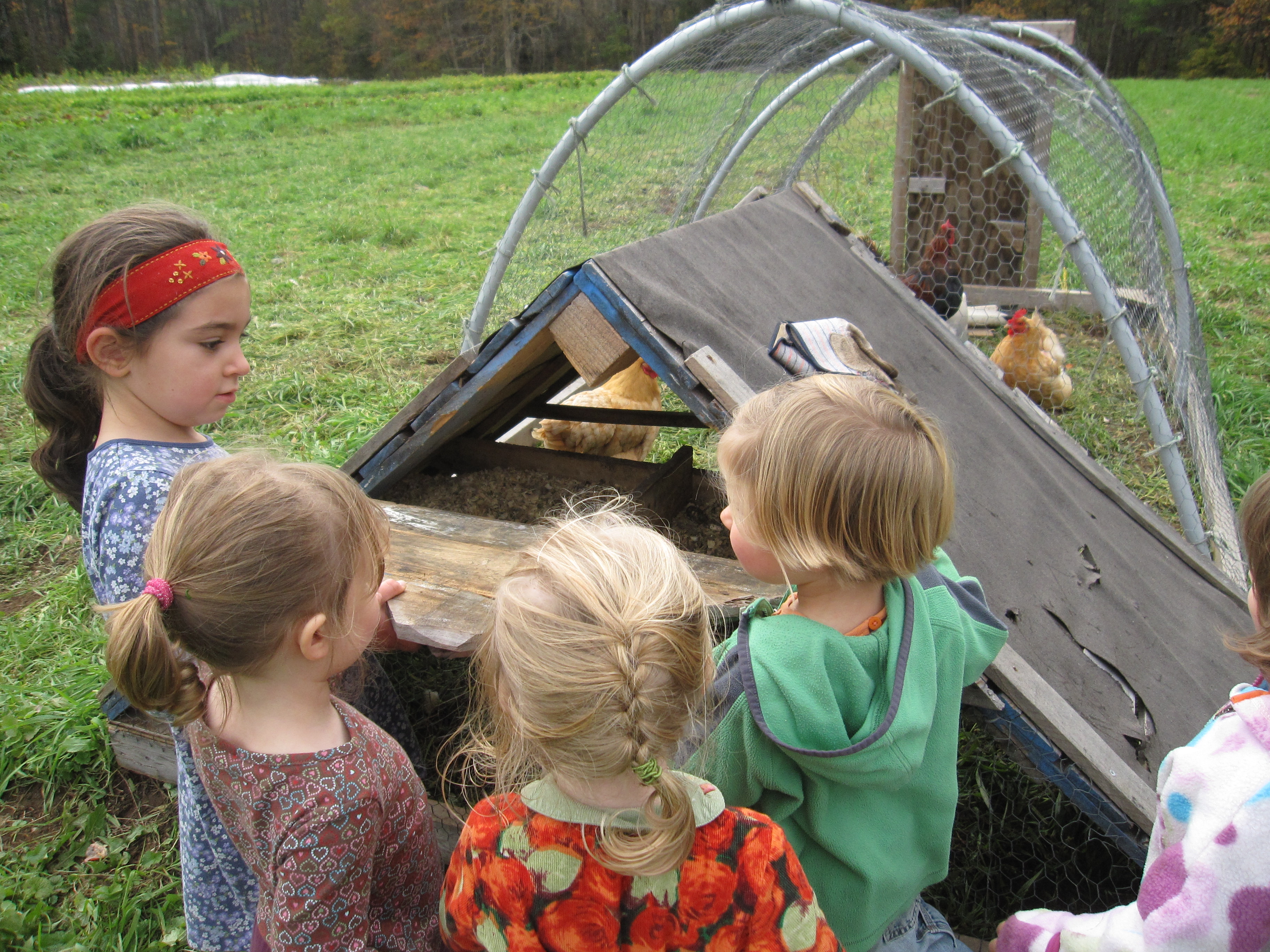 A scene from Saturday’s potluck at the farm: the little girls carefully inspecting the chicken tractor for eggs.