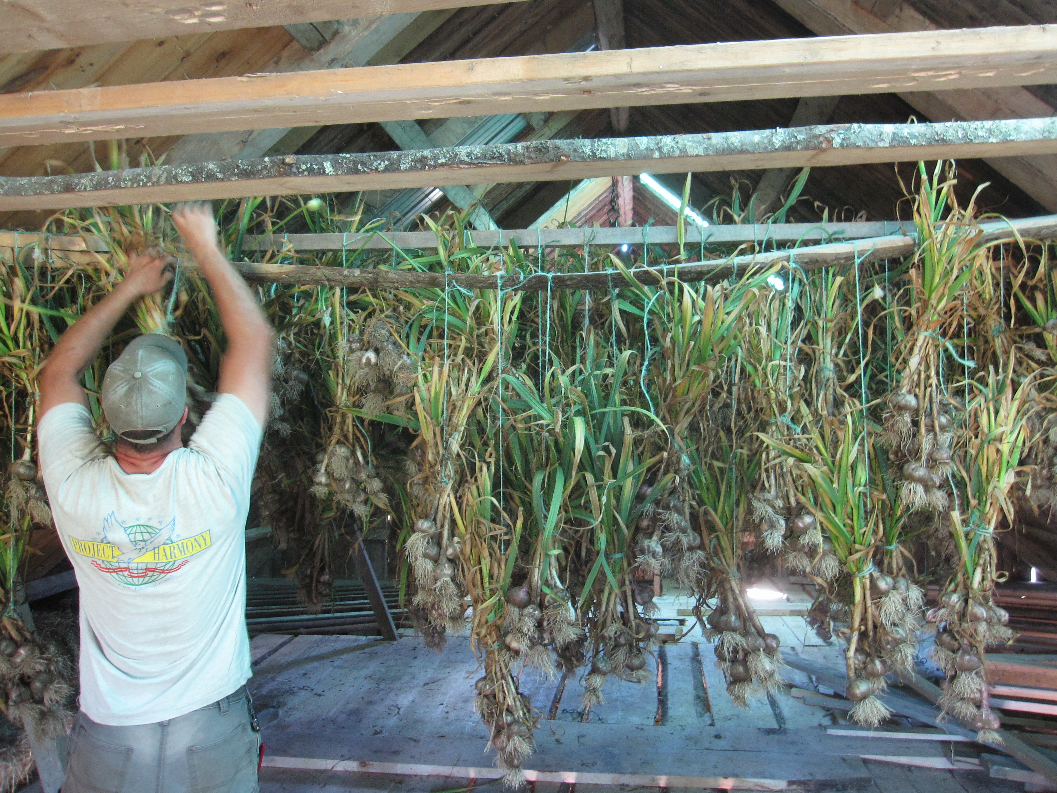 Bill hanging garlic to cure on the third floor of the barn. Ten bulbs are tied together to create one bunch, and then the bunches are staggered for maximum air flow.