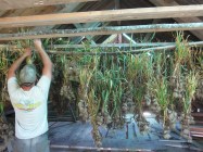 008 Published July 28, 2012 at 3648 × 2736 in CSA Week Seven Bill hanging garlic to cure on the third floor of the barn. Ten bulbs are tied together to create one bunch, and then the bunches are staggered for maximum air flow.