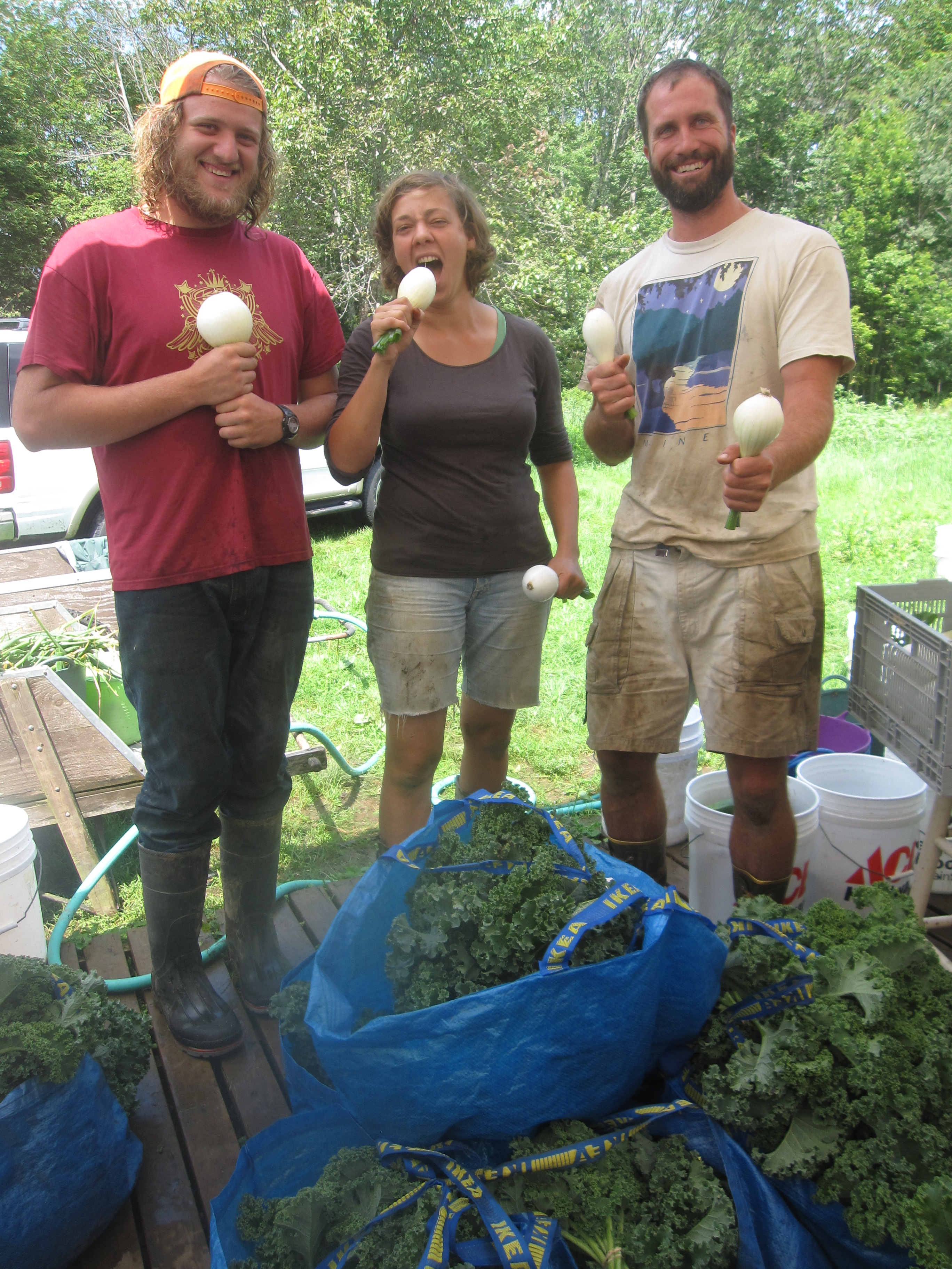 The Saturday, August 3rd harvesting supercrew! L to R: Patrick Smith, getting ready to say a few words on his onion microphone. Christine Müller, belting one out (or getting ready to eat the onion raw?). And Bill Pluecker, onion maraca player extraordinaire.