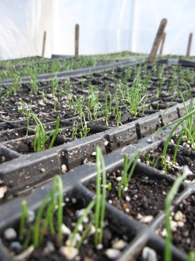 Yesterday Bill carefully swaddled the tomato seedlings that he had started in the house, cradled them 20 feet into the waiting heated car, drove them 200 feet down the driveway, and spirited them into the warm greenhouse, before transplanting them one by one into individual pots. Anything to keep his babies warm, sheltered and thriving! Hopefully this means that we’ll have some earlier-than-usual tomatoes for the CSA this year. We had an anxious moment when one of the greenhouse heaters stopped working on Tuesday, but we got everything up and running by the time the chill winds hit last night. Bill also spoke at the Climate Solutions conference in Augusta on Wednesday, and Reba gave a talk about the farm to a wonderful group of ladies in Rockland, so it definitely feels like we’re coming out of hibernation!