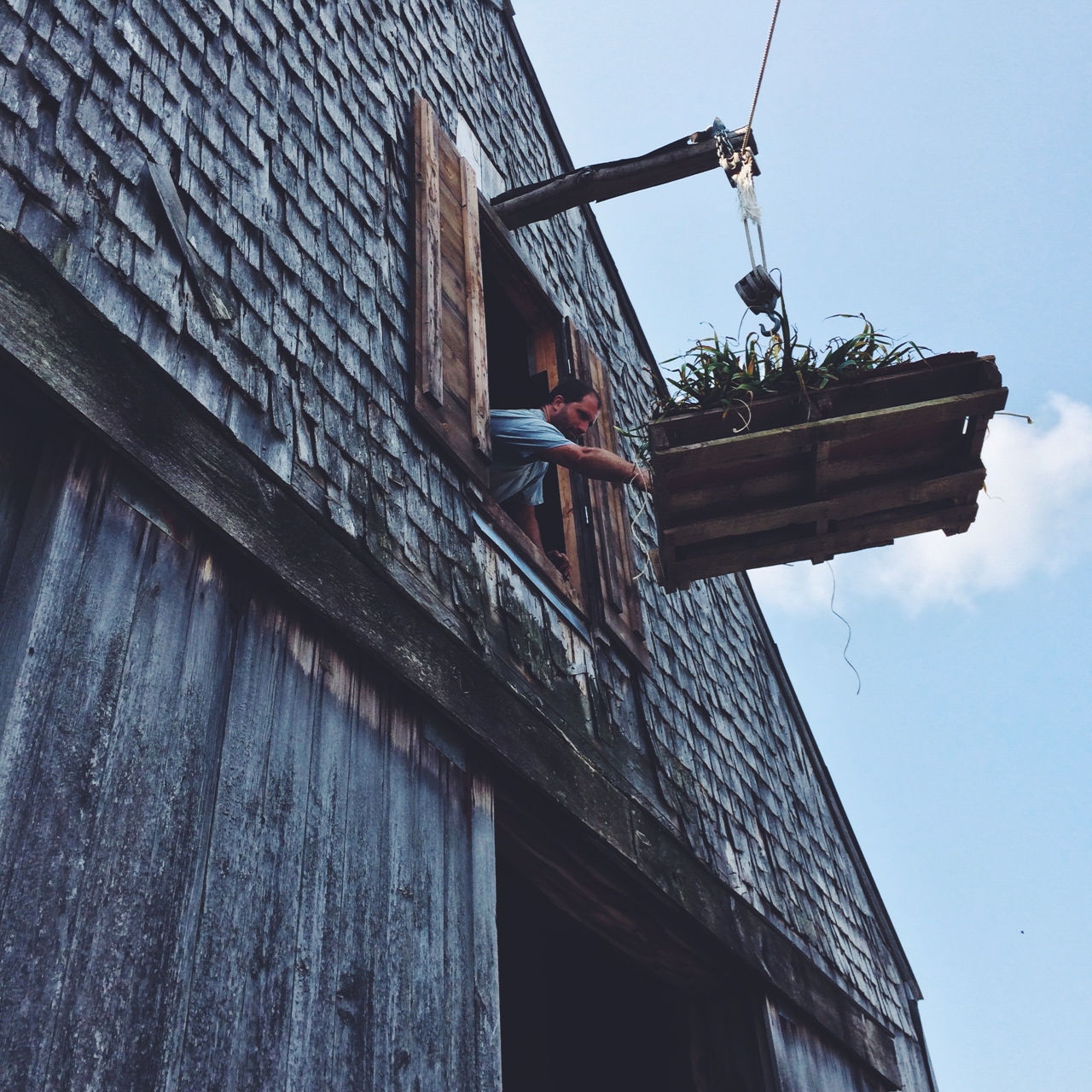 Friday was an incredible garlic harvest day! Even though we are yet to complete the harvest, we brought in as many bulbs on Friday as we did all of last year. We think we’ve pulled somewhere around 7,000 bulbs so far, and hope to complete the harvest next week. Thank you to Janina, Nancy, John and Sam, Phyllis, Monica, Maria, Doug, Shlomit, Bev, Heather, Sarah, Brendon, Karen, Prairie, Susie, Emily and Ruth and Nellie, Claire and Tom, Lily, and of course our great regular crew: Gordon, Hannah, Burley and Katie. With our new high-tech sorting equipment (that is, different size holes drilled in a piece of wood that you can use to measure the size of the garlic), the garlic grading happened speedily and accurately. There were garlic pullers (the hard physical work), sorters, twine cutters (a good job for our friend who arrived with a broken foot) and bunchers. And then, of course, there is the person who hauls ten bunches of garlic at a time up to Bill, who hangs out of a door on the third floor of the barn to pull them in. I got the chance to learn all over again that ten bunches of the huge garlic is far heavier than ten bunches of the small garlic!